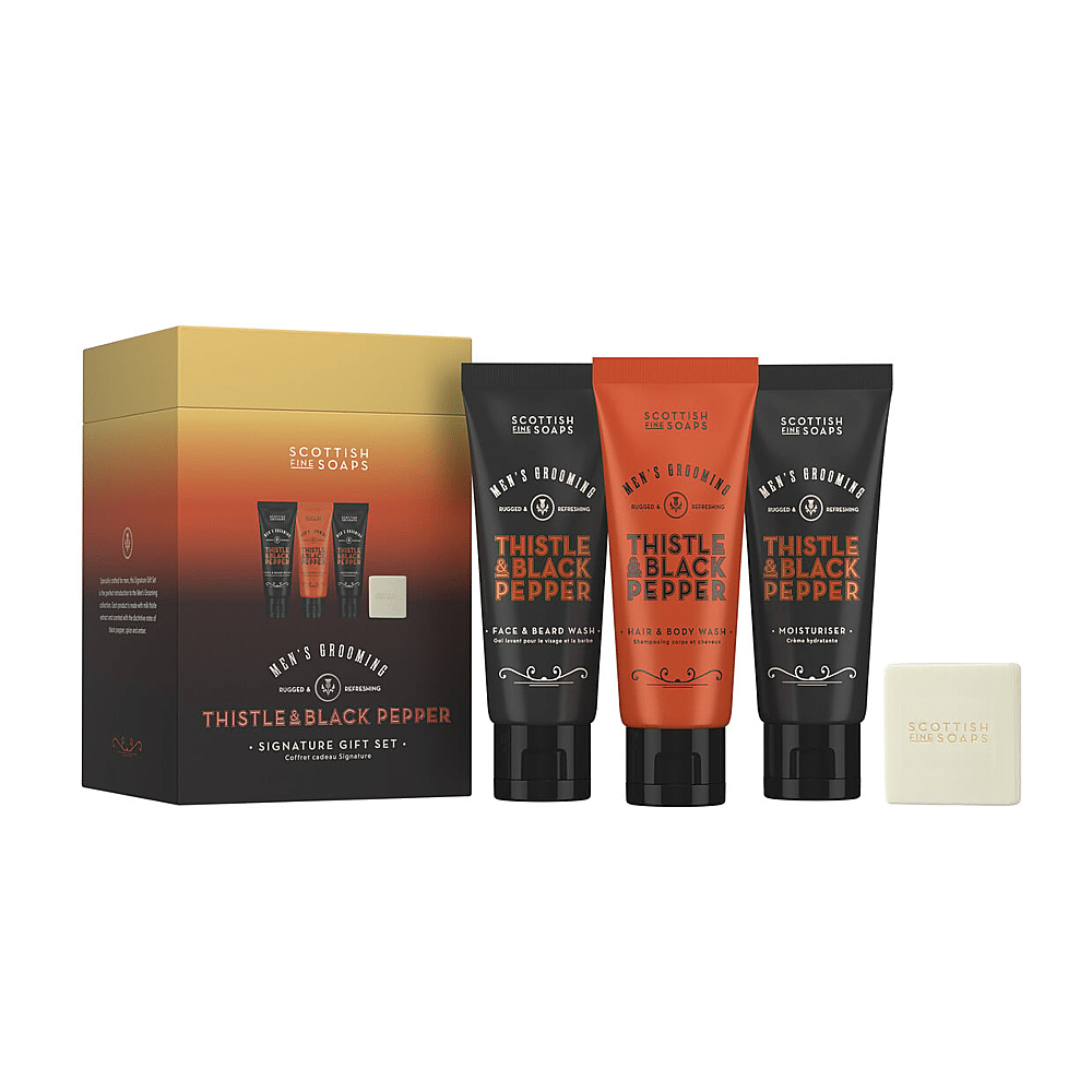 Scottish Fine Soaps Thistle & Black Pepper Signature Gift Set (3x75ml Tubes, 1x40g Soap) | 1 pakket (4pc)
